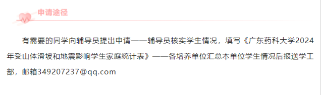 广东药科大学提出,对因山体滑坡灾害、地震灾害及低温雨雪冰冻灾害等受影响致困的学生给予帮扶救助,切实保障学生正常的学习生活。可根据下图指示进行申请。