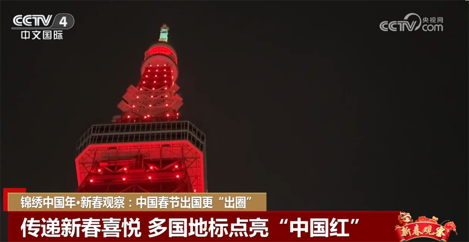 为欢庆春节,多国地标建筑都点亮了“中国红”。英国伦敦的巨型摩天轮“伦敦眼”亮起红色和金色灯光,象征幸福吉祥;在日本东京,东京塔换上一身红装,为龙年送上祝福;加拿大最大城市多伦多市的地标建筑加拿大国家电视塔也在落日一个小时后开始“亮红”,迎接龙年新春的到来。