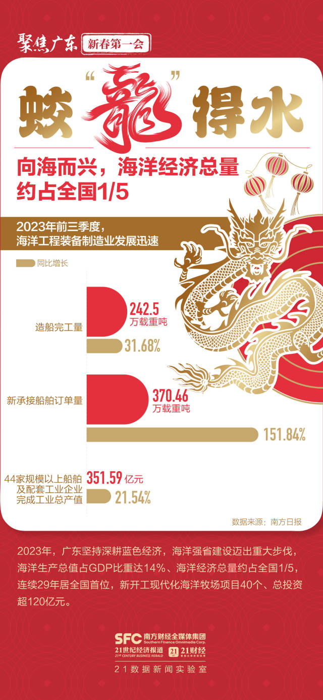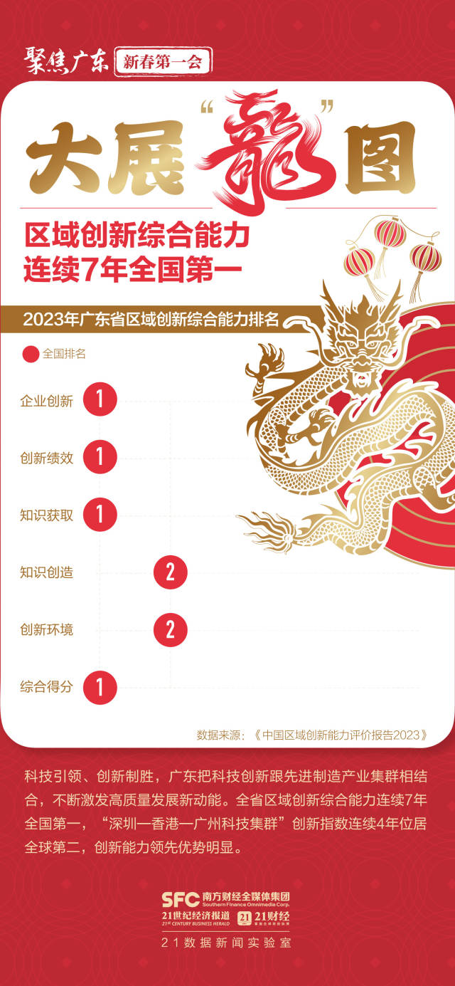 2023年广东全力以赴拼经济,交出了一份来之不易的高质量发展答卷:地区生产总值达到13.57万亿元、连续35年全国第一,区域创新综合能力连续7年全国第一,规上工业企业突破7万家、营业收入突破18万亿元……