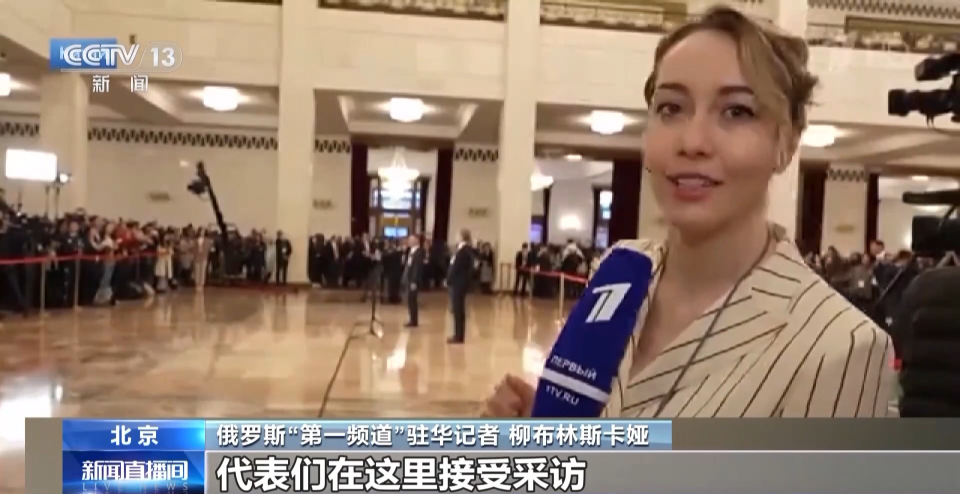 俄罗斯“第一频道”驻华记者 柳布林斯卡娅:记者太多了,现在记者提问席已经排成了一排、两排、三排、四排、五排、六排。代表们在这里接受采访,采访说中文。