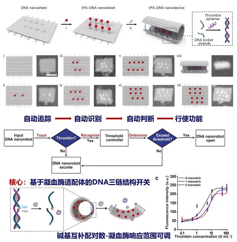 科研人员首先基于折纸技术构造了一个长90纳米、宽60纳米的矩形片,再将溶栓药物分子放在矩形片上。随后,科研人员利用DNA三链结构设计了一种门控开关,它将矩形片卷成纳米管,把药物保护起来。门控开关内含凝血酶适配体,能够自动检测并跟踪凝血酶浓度,在血栓附近时打开释放药物。纳米机器可准确区分正常纤维蛋白凝块及血栓,显著降低了溶栓药物造成的凝血异常,实现智能化的精准给药,并在脑中风、肺栓塞、颈动脉及腿静脉血栓动物模型中得到验证。