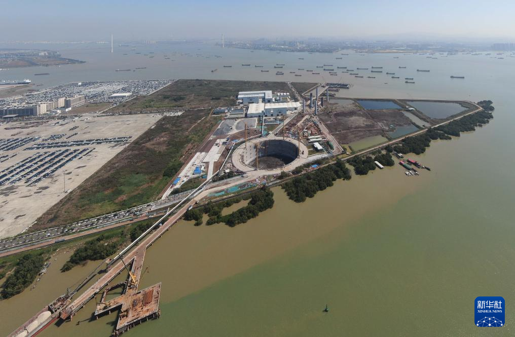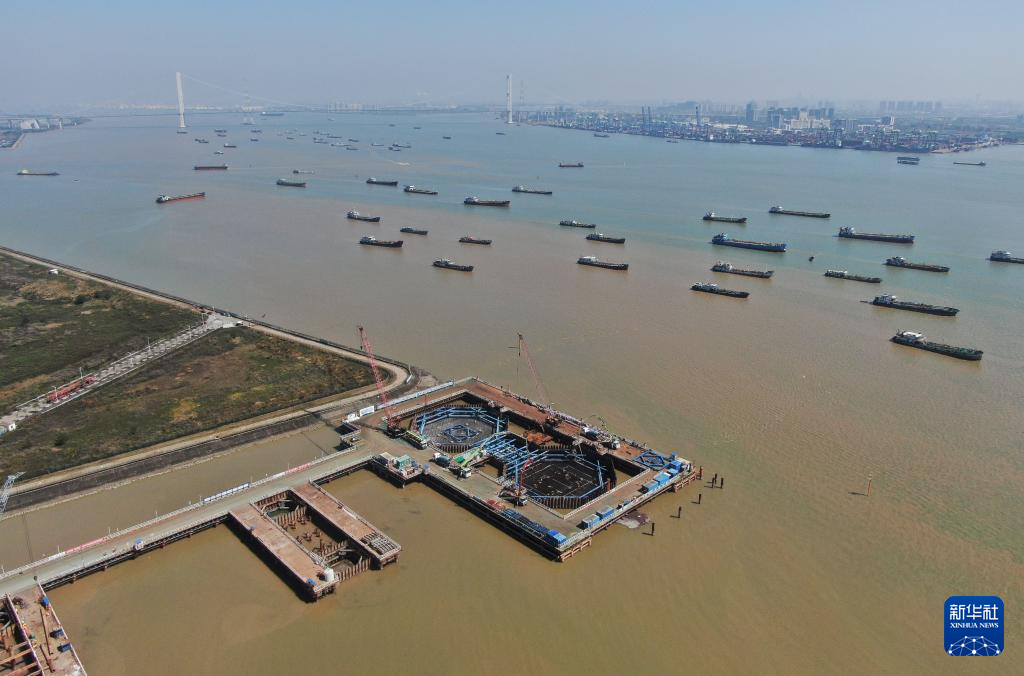 这是狮子洋大桥西锚碇及远处的西主塔承台施工现场(3月12日摄,无人机照片)。
