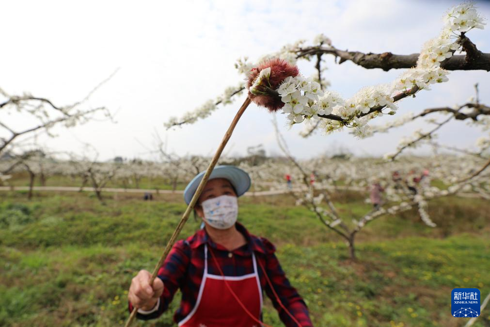 3月14日,在四川省广安市武胜县鸣钟镇,果农在进行人工授粉。