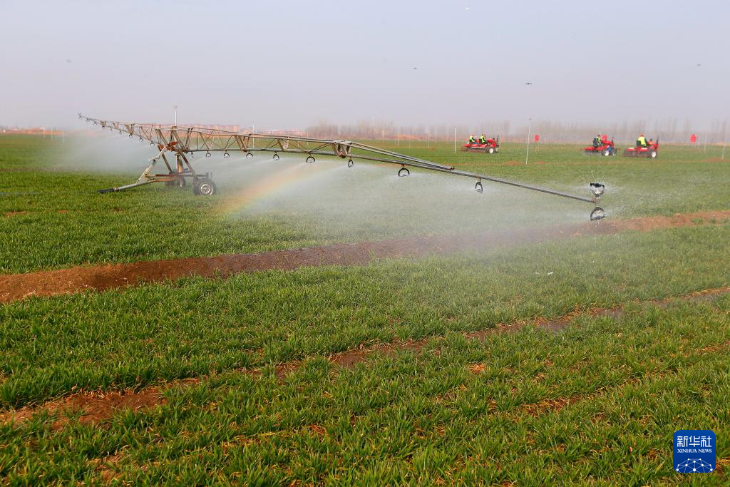 3月14日,在山东省青岛市即墨区蓝村街道,智能喷灌机在麦田里进行灌溉作业。