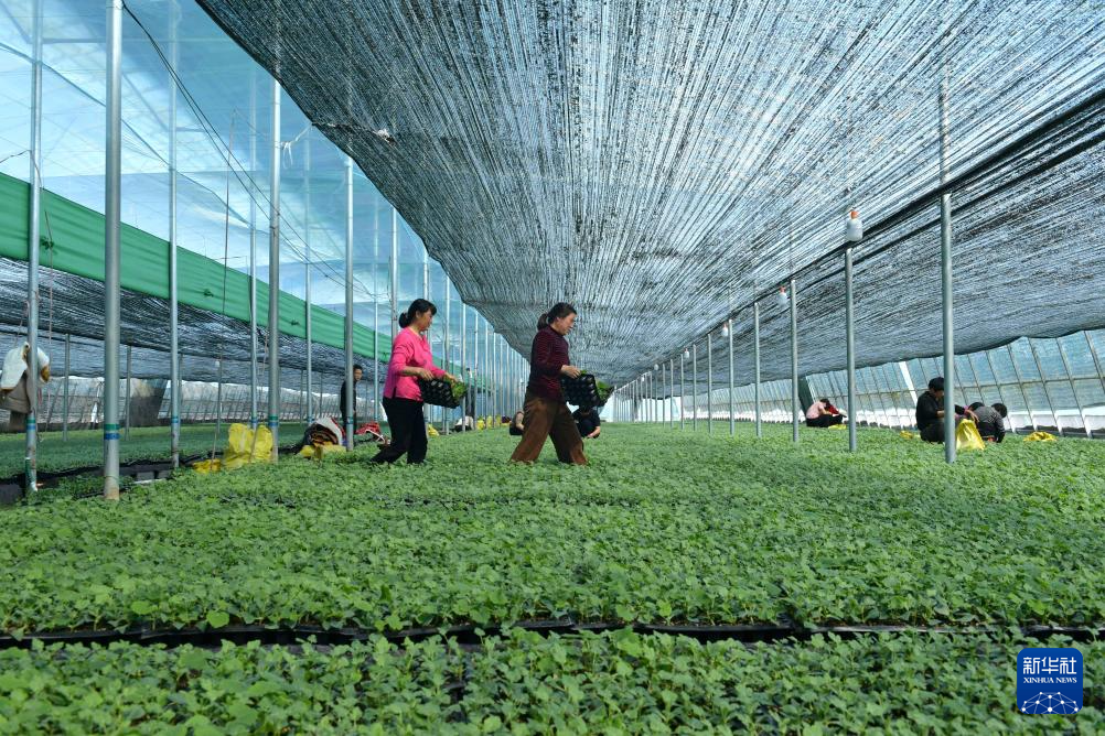 3月14日,在山东省淄博市沂源县,农民在大棚里管护种植的蔬菜。
