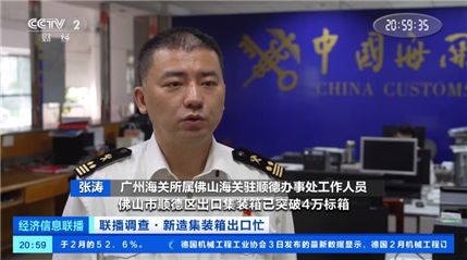 广州海关所属佛山海关驻顺德办事处工作人员 张涛:今年前2个月,佛山市顺德区出口集装箱已突破4万标箱,同比增长4.6倍左右。结合新造集装箱既是货物,又是运输工具的行业特性,在码头设置新造集装箱专用堆场。