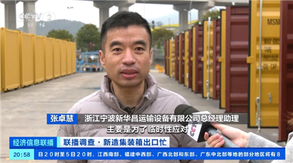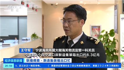 宁波海关所属大榭海关物流监管一科关员 王守军:今年前2个月宁波口岸新造集装箱出口约8.3亿元,同比增长近4倍。
