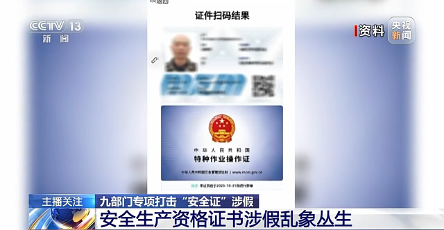 应急管理部执法工贸局局长 杨智慧:目前安全生产资格证书包括三类,一类是对高危行业企业的主要负责人,一类是高危行业企业的安全监管人员,这是必须持证上岗的,第三类就是特种作业人员必须持证上岗。特种作业操作证造假的比较多的,一个是住建部门的电工,架子工,就是咱们的高处作业,包括我们应急部管理的焊工,还有市场监管总局的特种设备操作证,这是市场需求量比较大,造假、制假比较多的几类。