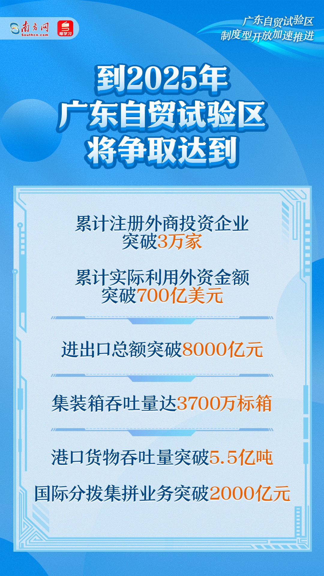 蓝图绘就风正劲。目前,广东正围绕实施自贸试验区提升战略,全面提升广东自贸试验区改革、开放、创新发展水平,为国家扩大高水平对外开放试点探路。