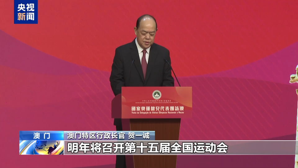 澳门特区行政长官 贺一诚:明年将召开第十五届全国运动会,澳门是主办地之一。特区政府将全力参与和配合组委会的工作,携手广东、香港,认真贯彻落实二十届三中全会精神,共同确保全运会各项工作圆满完成。