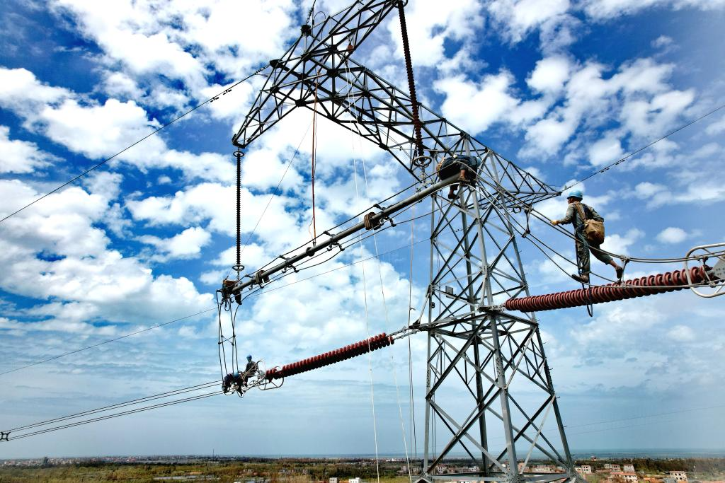 台风后,抢修人员正在对湛江徐闻重点线路——500千伏福徐线受损跳线以及绝缘子进行紧急更换。(广东电网供图)