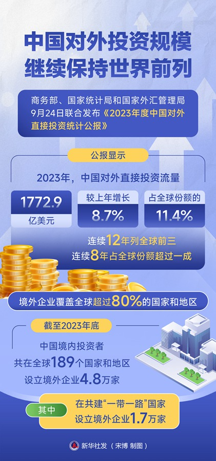 新华社北京9月24日电(记者谢希瑶)商务部、国家统计局和国家外汇管理局24日联合发布《2023年度中国对外直接投资统计公报》。公报显示,中国对外投资规模继续保持世界前列。