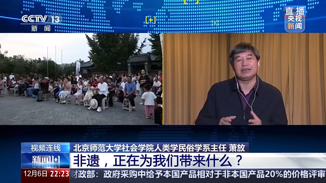 北京师范大学社会学院人类学民俗学系主任 萧放:春节就是大年,大年是年年过,当然年年都过得喜庆热闹,今年因为是成为人类非遗之后的第一个春节,当然我们就过得更加热闹,更加红火,更加喜庆。但如何让我们热闹、喜庆、红火实现呢?就需要我们更多的人自觉地去参与这个年节活动,或者各个地方政府创造条件,让我们年节的氛围更加浓郁,让我们年节喜悦的气氛更加热烈,然后我们可能说既然是人类非遗之后的第一个春节,我们是不是有更多的传统热闹的方式,能够让我们进行呢,我想这是我们地方政府管理部门可以考虑的问题。