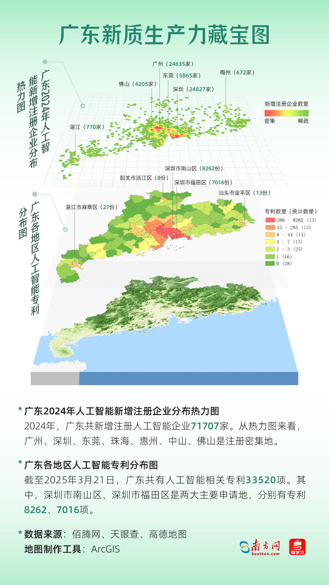 结合广东2024年人工智能新增注册企业分布热力图和各地区人工智能专利分布图来看,珠三角仍是新质生产力的主要发展阵地。