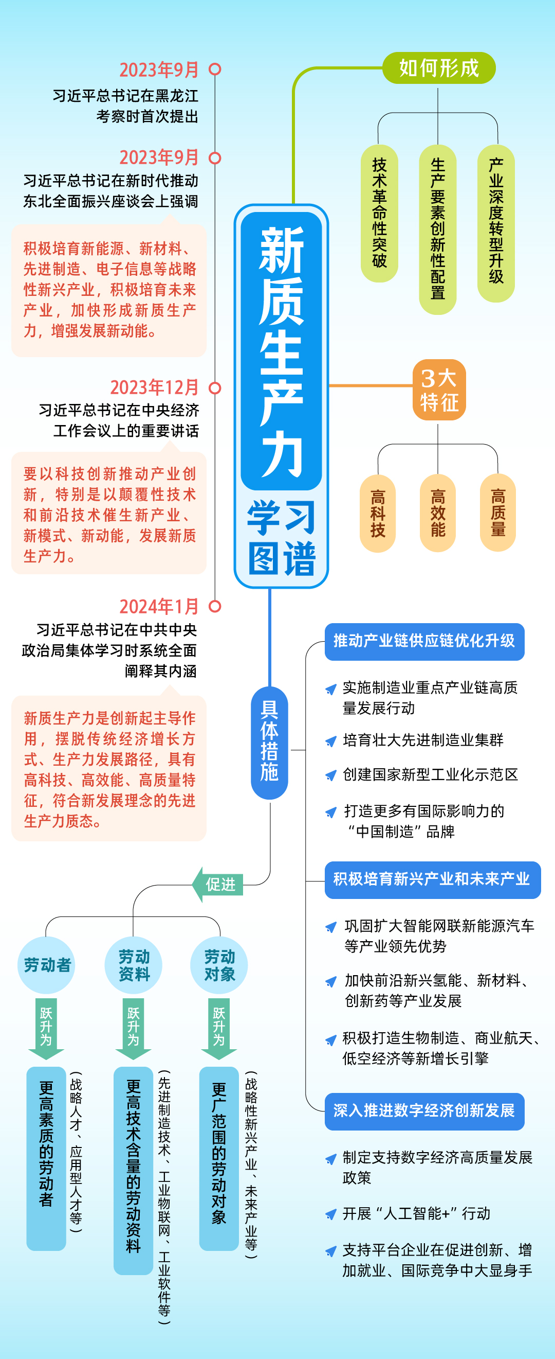 2024年1月,习近平总书记在中央政治局集体学习时系统全面阐释其内涵:“新质生产力是创新起主导作用,摆脱传统经济增长方式、生产力发展路径,具有高科技、高效能、高质量特征,符合新发展理念的先进生产力质态。”