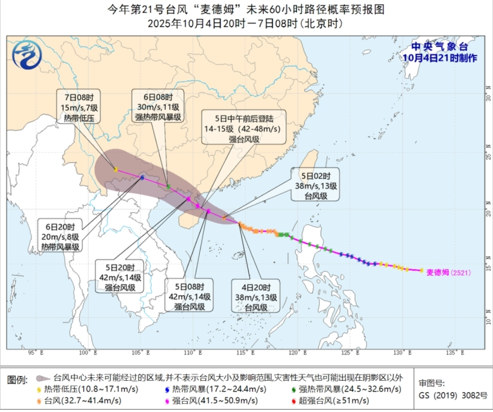 截至4日17时,“麦德姆”位于距离湛江徐闻东偏南方向约520公里的海面上,中心附近最大风力12级。