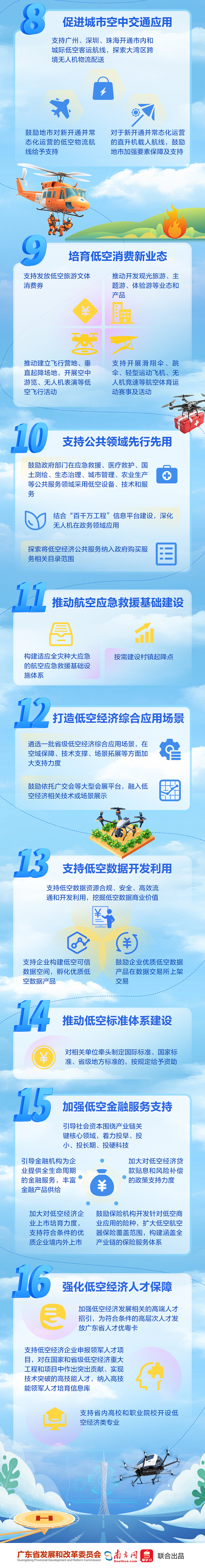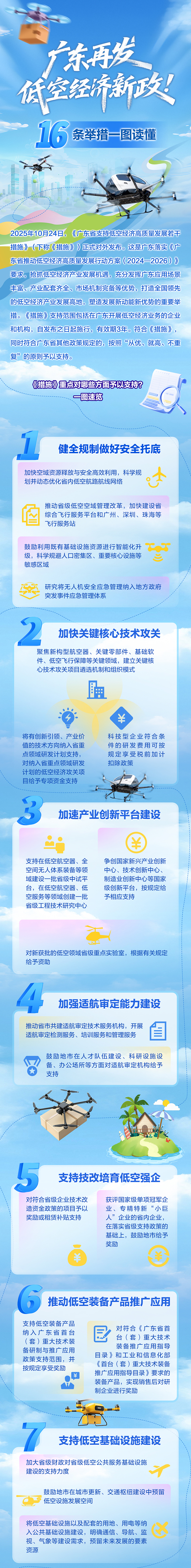为落实《广东省推动低空经济高质量发展行动方案(2024-2026)》要求,10月24日,《广东省支持低空经济高质量发展若干措施》(下称《措施》)正式对外发布。《措施》包含16条支持举措,涵盖低空安全、研发、适航审定、基础设施、应用场景等多个方面,为广东打造全国领先的低空经济产业发展高地,塑造发展新动能新优势。