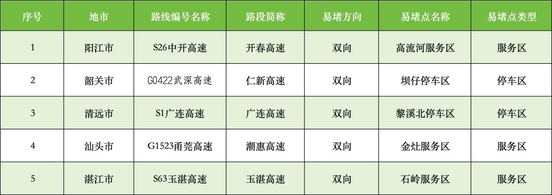 经省公安厅交管局与省交通运输厅联合研判,2026年广东省清明假期较为拥堵的路段、收费站、车流较饱和服务区以及充电设施利用率高的服务区如下:
