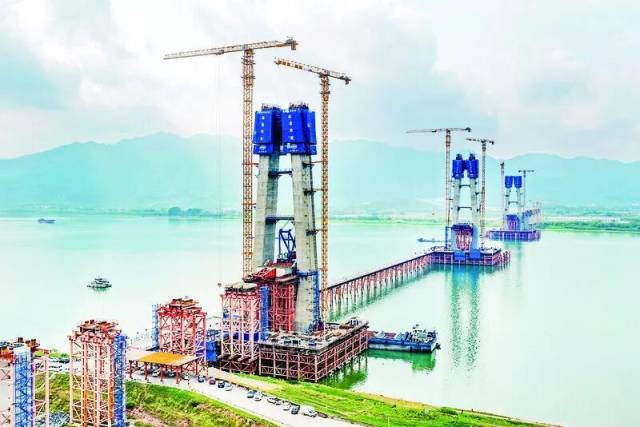 日前,在珠肇高铁控制性工程西江特大桥施工现场,巨大的桥塔正在火热建设。