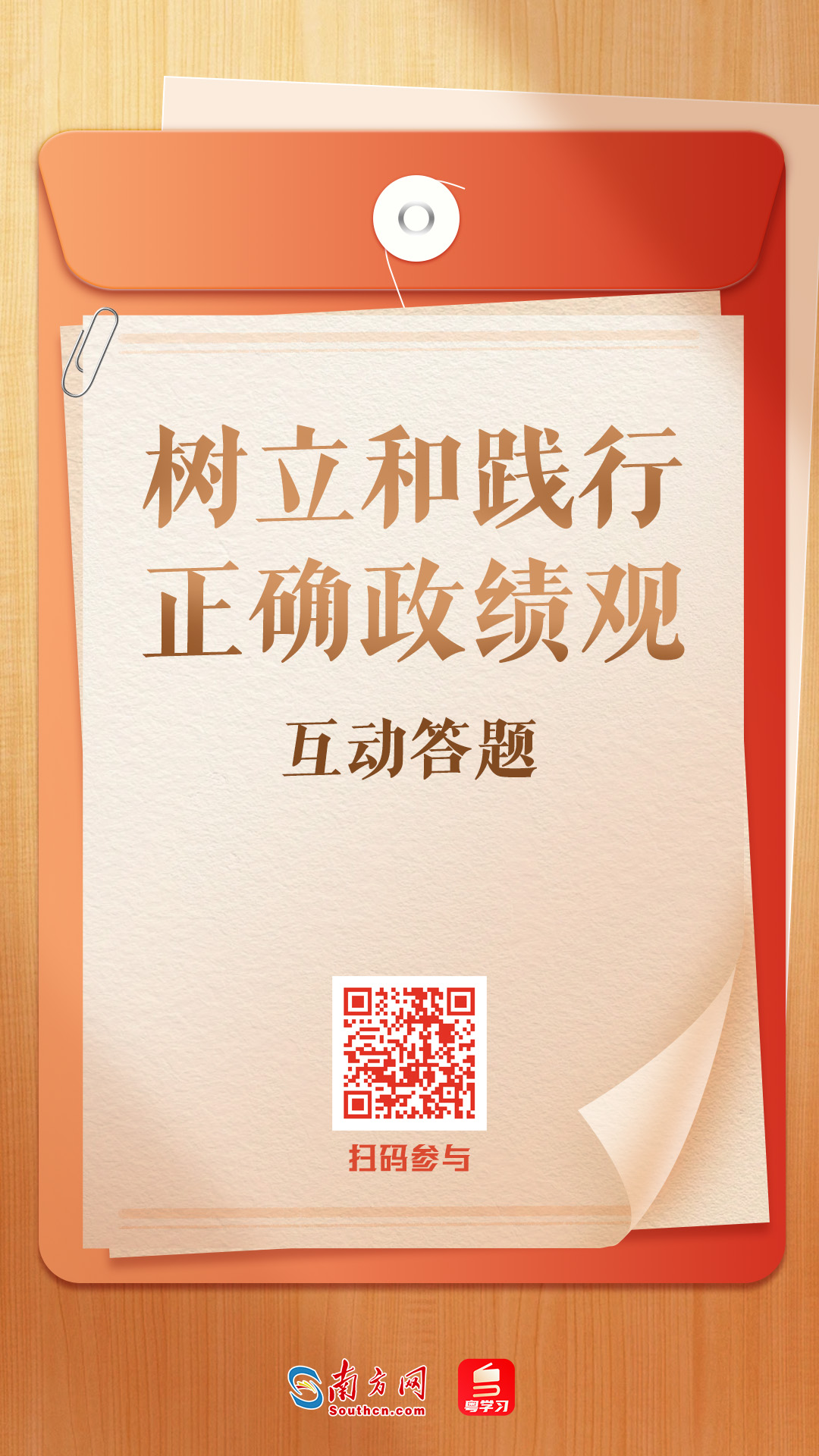 南方网、粤学习客户端特此推出《“树立和践行正确政绩观”互动答题》,其中全部题目均以《习近平关于树立和践行正确政绩观论述摘编》相关原文为依据,设有多种题型、多个关卡。完成答题后,广大网友还可进入趣味互动场景,沉浸式体验如何树立和践行正确政绩观。快来试试吧!