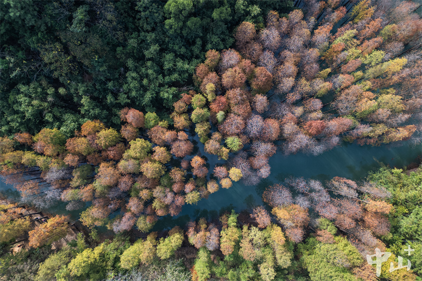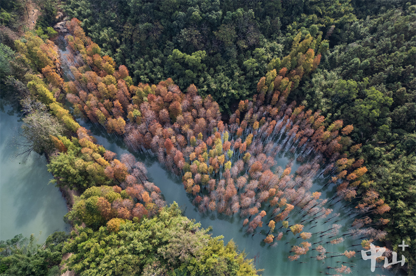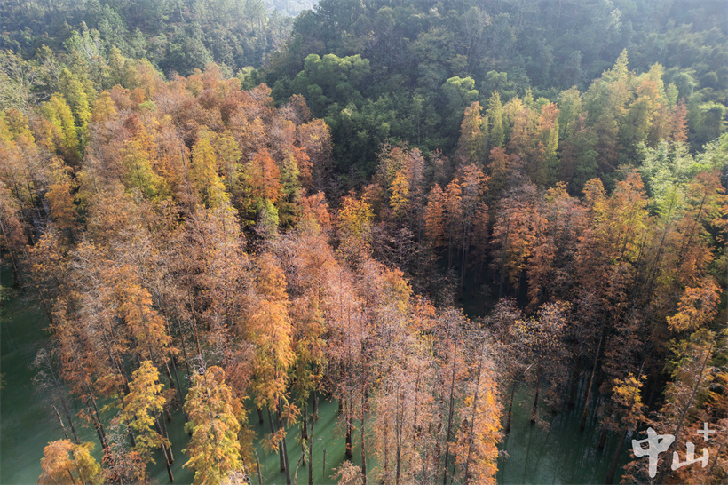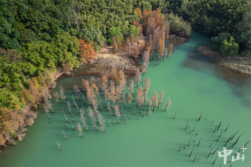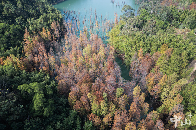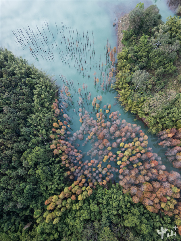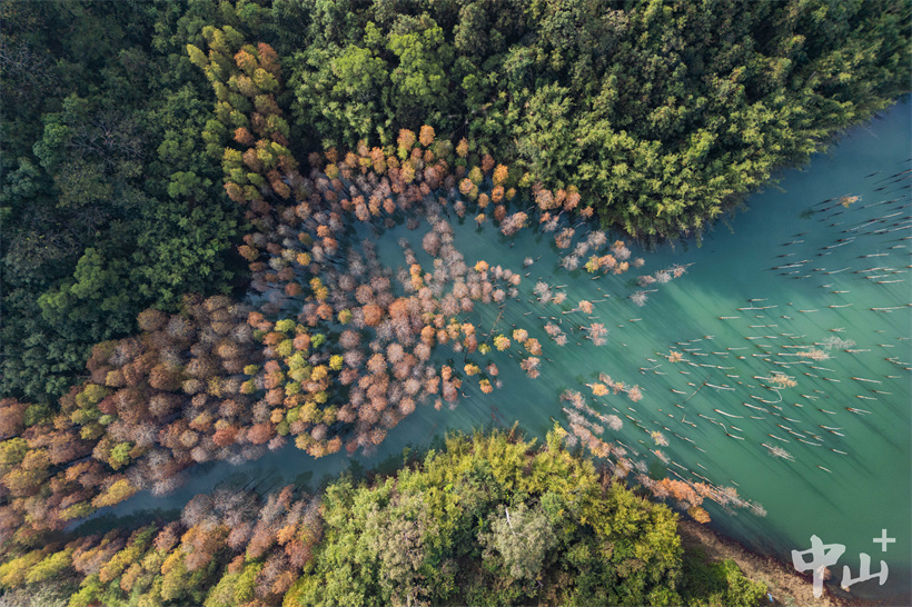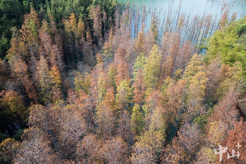 近日,五桂山街道石寨水库的水杉林景色进入最美时节。该水杉林色彩层次丰富,枝叶间错落分布着翠绿、金黄与深红等色调,与澄澈碧绿的湖水相映成景,构成了一幅颇具生态美感的自然画卷。阳光穿透枝叶,在林间形成斑驳光影,微风徐来,光影随枝叶轻晃流转,不仅为水杉林增添了灵动气韵,更营造出静谧祥和的氛围。这处位于五桂山腹地的自然景观因其“高颜值”,被网友誉为中山的“阿勒泰”“小九寨”。