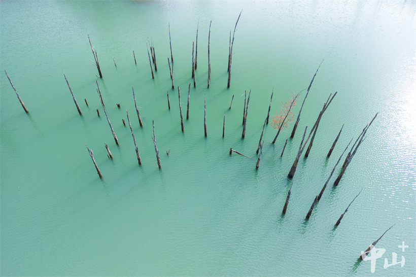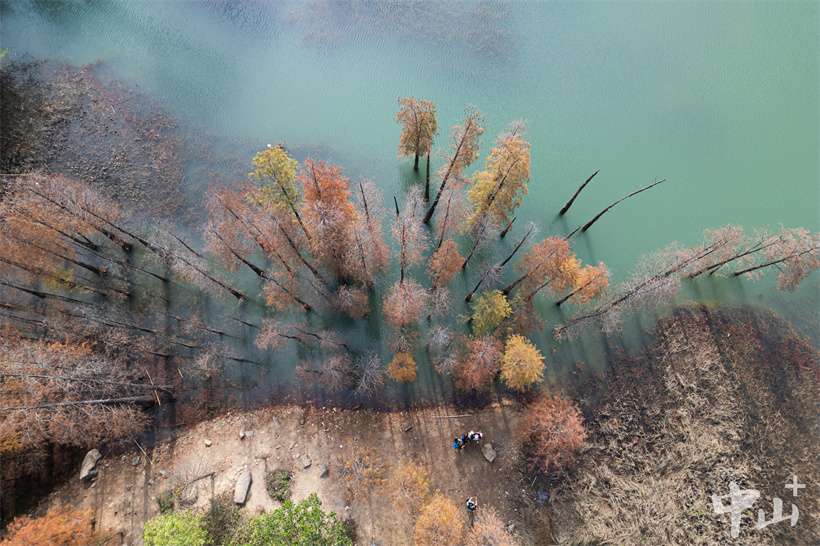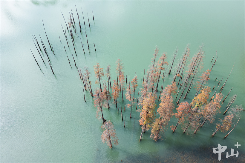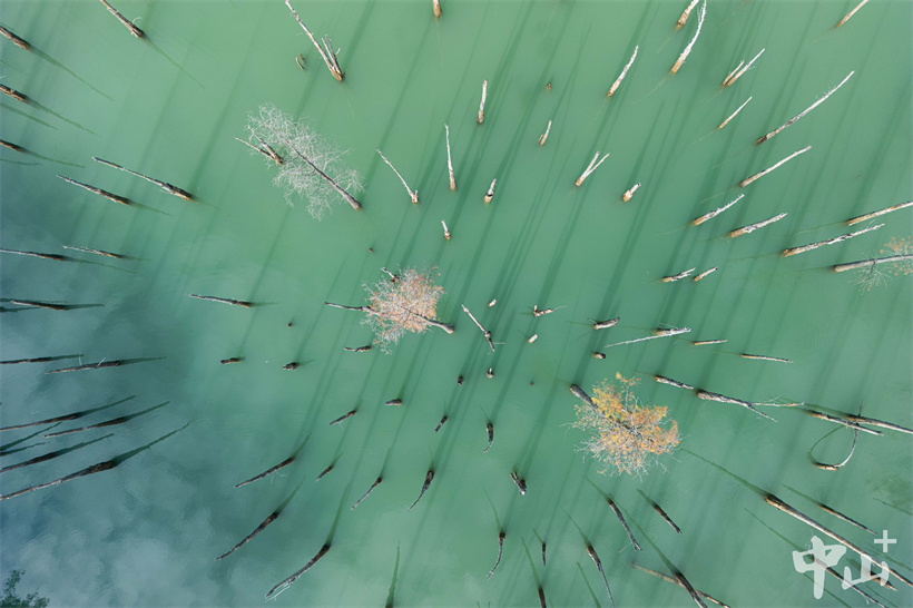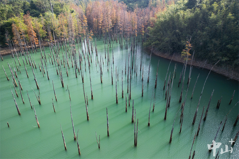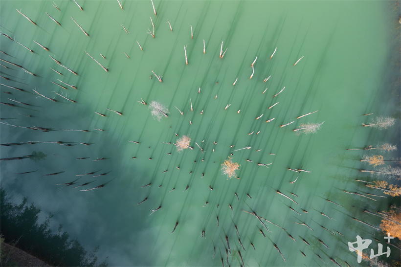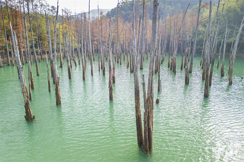 ▲碧绿色水库中,金黄的落羽杉与枯槁的树干伫立在水中,与岸边浓郁的翠绿山林形成鲜明对比。