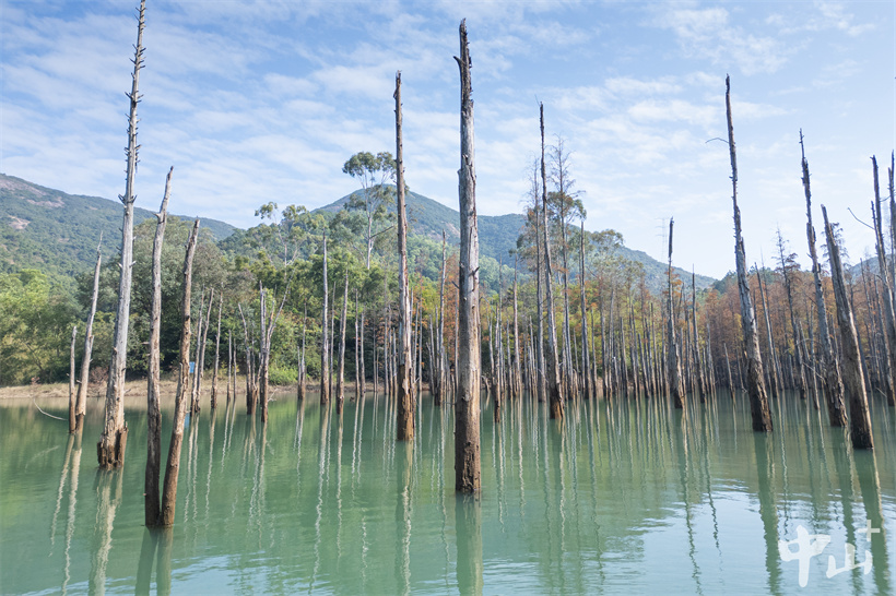 ▲水中枯槁的树干在岸边翠绿山林的衬托下,更显 “水中枯林” 的静谧与苍凉感。