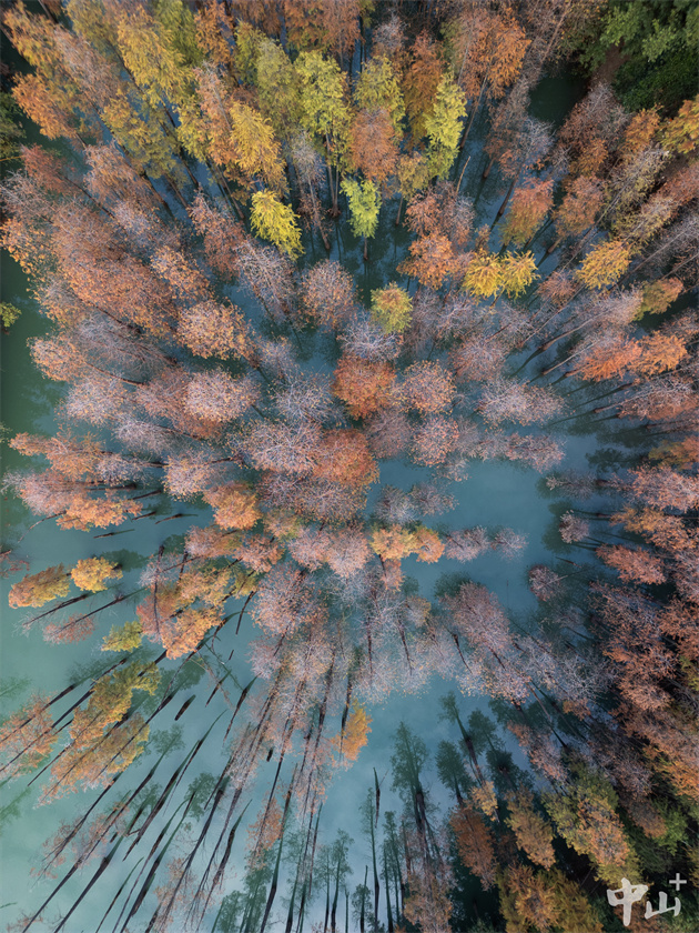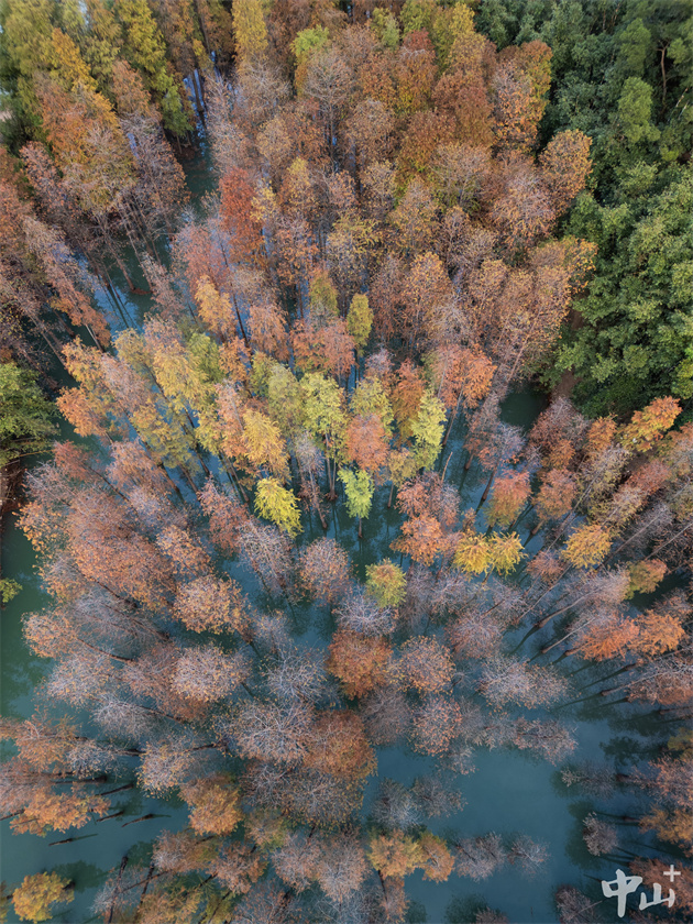 ▲颜色丰富的落羽杉像给湖面铺了一层暖色调的 “彩叶地毯”。