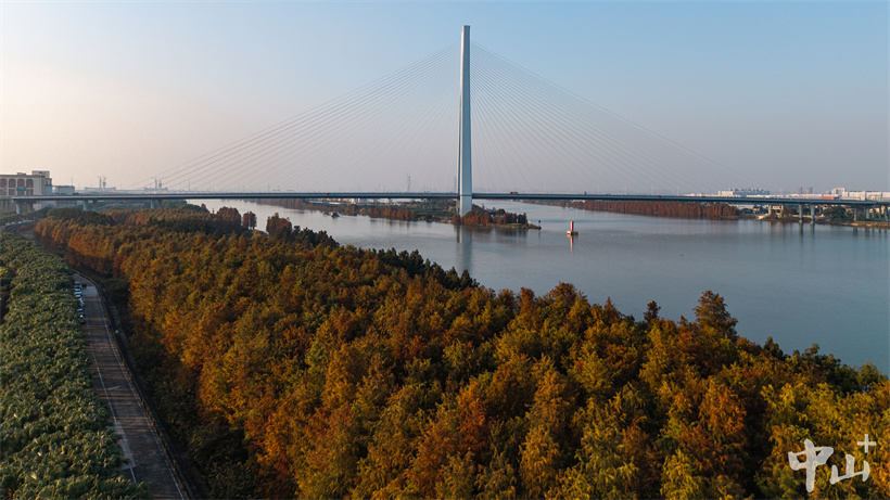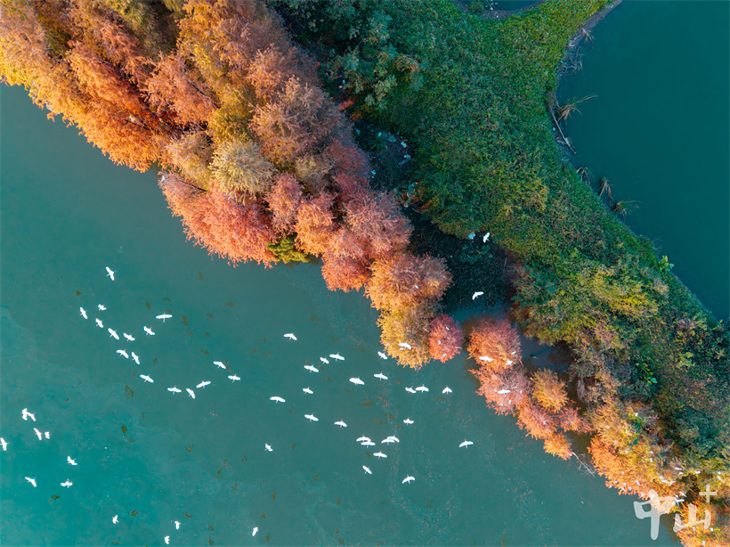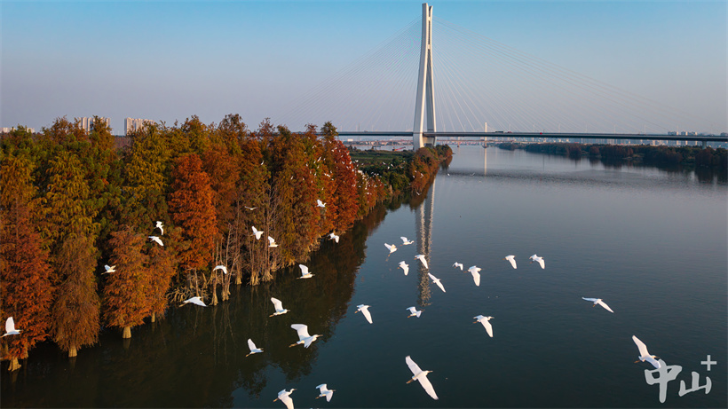 1月13日,港口镇中顺大围东干堤河道旁成片的落羽杉已“换装”变红。色彩绚丽的落羽杉依江而立,连绵不断,与南中高速大桥相互映衬,构成了冬日里绝美的山水画卷。江面上,时有白鹭飞舞,洁白的身影在落羽杉和江水之间穿梭,宛如跳动的音符,尽显灵动之美。不少市民和游客被这片落羽杉美景所吸引,纷纷前来拍照“打卡”。