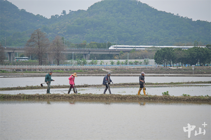 ▲村民带着锄头到水田里整理田埂。
