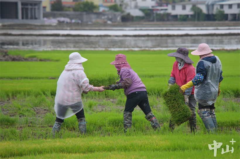 ▲村民在秧田里传递秧苗。