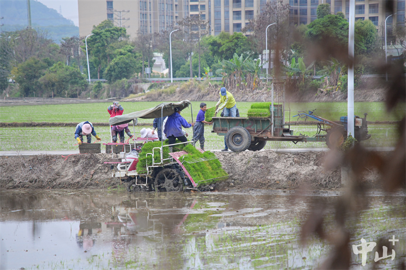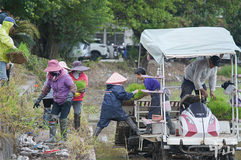 ▲村民合力将秧苗传递到插秧机上。