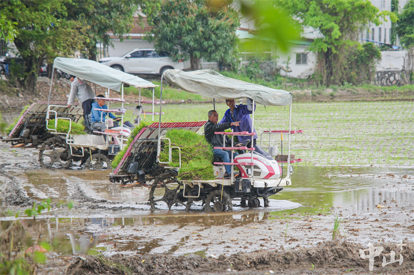 ▲插秧机来回奔忙,稻田边一片忙碌的景象。
