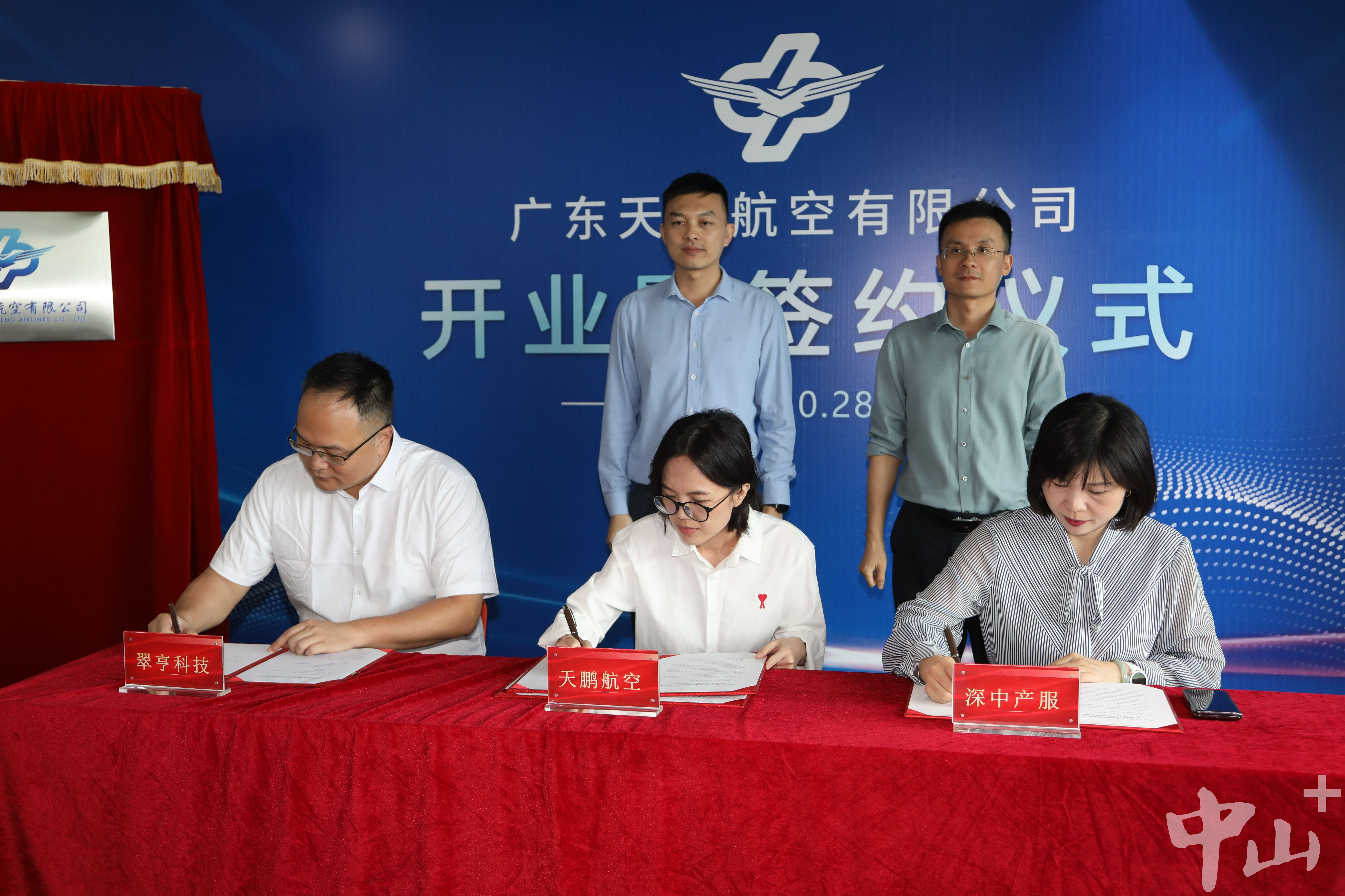 现场举行了战略签约仪式。天鹏航空与翠亨集团、翠亨科技、深中(广东)产业服务有限公司、湖北天鹰飞行智能科技有限公司、华研(舟山市)科技有限公司、广东军旭特种装备科技有限公司等多家企业签署了合作协议。