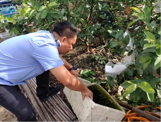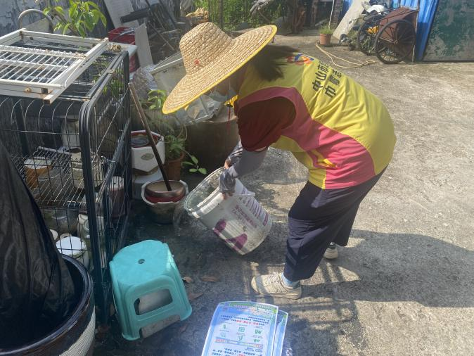 党员突击队与居民志愿者组成“攻坚小组”,带着手套、扫帚逐个点位排查。入户行动更显细致:志愿者手把手教居民用“封、填、疏、排、清”五步法处理积水——水缸加盖、洼地填平、沟渠疏通、托盘控水、垃圾清零,连美人蕉叶片的积水都不放过,从源头斩断蚊虫孳生路径。
