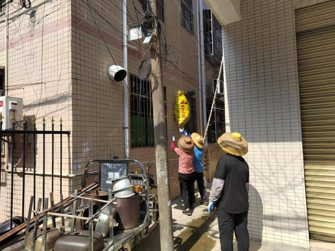 自建房天台常年堆积旧家具、破纸箱、废弃花盆等杂物,不仅孳生蚊虫,还存在安全隐患。攻坚小组创新采用“人链传送带”模式:在天台与地面之间,队员们分站不同楼层台阶,形成垂直传递链条,将较轻的塑料瓶、纸箱等垃圾逐层向下传递,直至地面收集点。遇到建筑垃圾等重型垃圾,队员们则用结实的尼龙绳将其牢牢捆扎,确保垃圾平稳落地,避免碰撞墙体造成损坏。与此同时,攻坚小组同步推进闲置地块、闲置房屋与冷巷清理,10月20日累计清理闲置地1.7亩、闲置房屋14间、冷巷33条、屋顶天台989处。