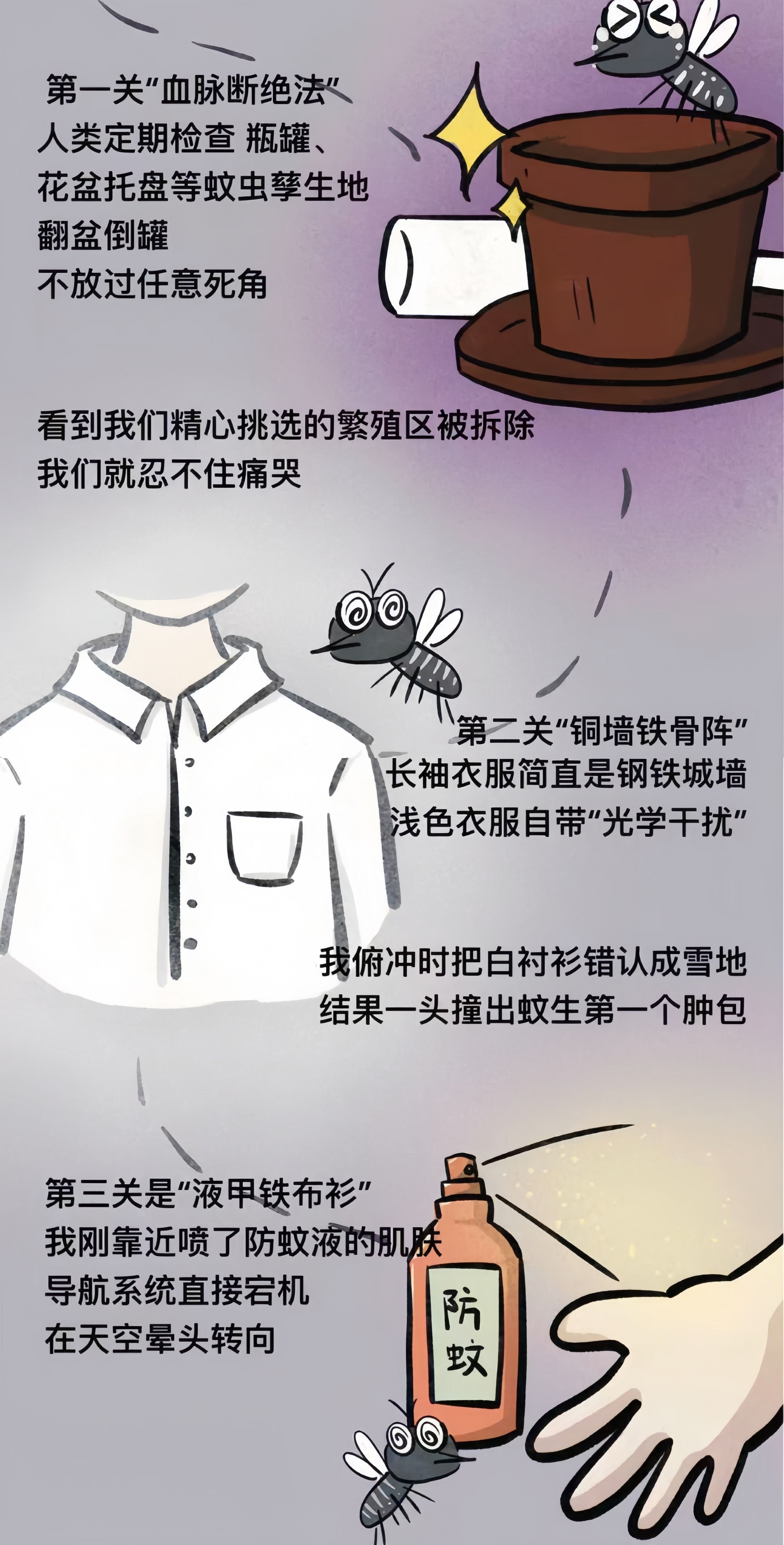 二是灭蚊虫。居家发现有成蚊时,可使用电蚊拍、灭蚊灯等物理措施灭蚊,科学合理使用市售有合格证号的家用卫生杀虫剂如蚊香、灭蚊片、杀虫气雾剂等化学方式灭蚊。