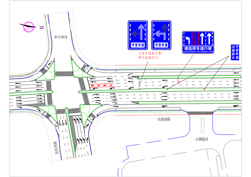 1个多月来,交警部门发现兴港南路/民科西路路口北往南方向车流量变化较为明显,该方向工作日以直行车流为主,周末、节假日左转车流居多。另外该方向车道数量设置受道路条件限制,无法进一步扩展,因此决定采取“可变车道”的动态管理措施可灵活调整车道设置,提高车道利用率。