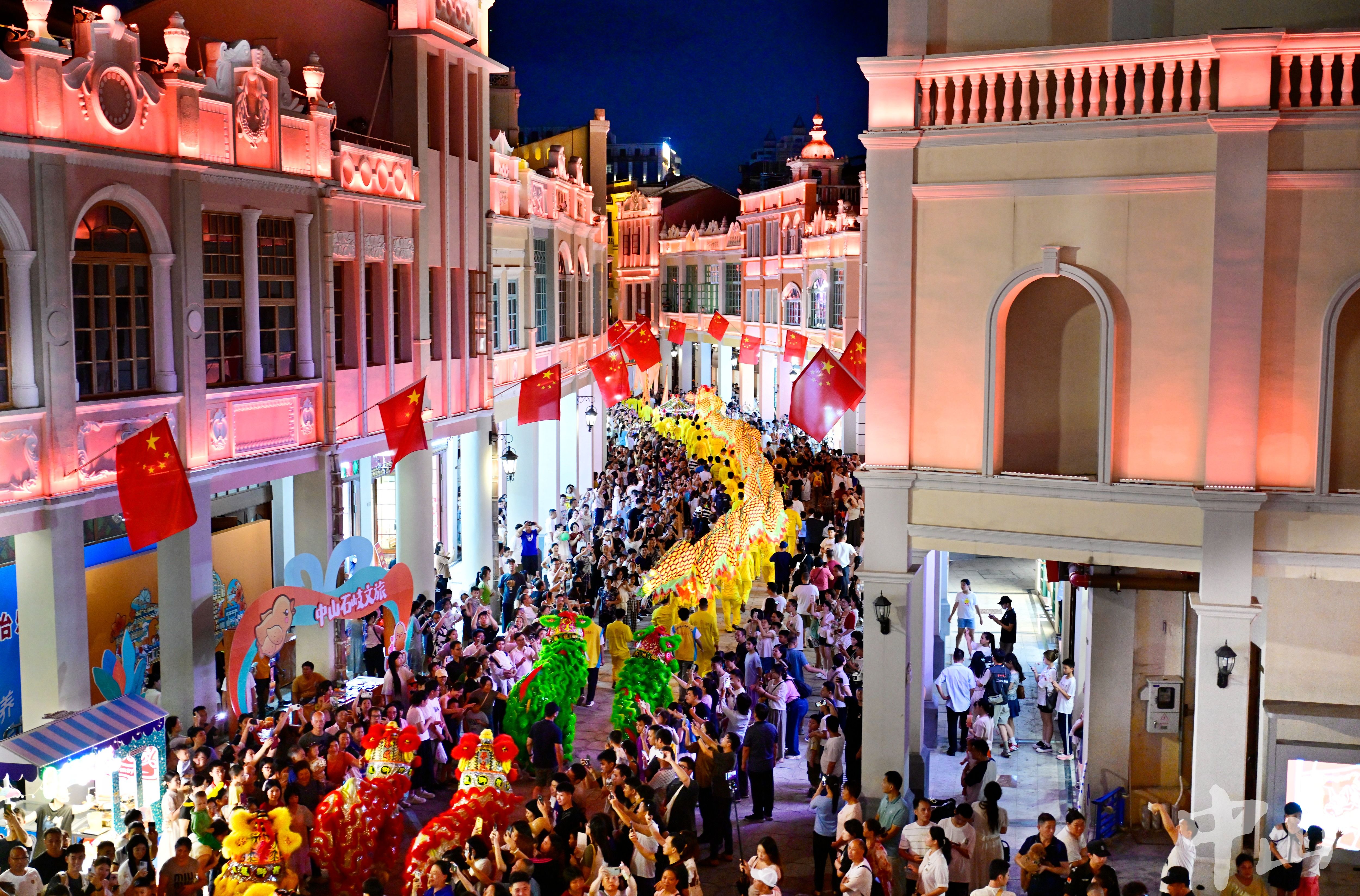 9月30日晚,大涌红博城华灯璀璨,“红博城·隆都之夜”活动在此举行。千架无人机以天为幕、以光为笔,在夜空中变幻出“盛世中华”“红博不夜城”图样,赢得满堂喝彩。夜空映照下,古风集市红火启动,为红博城带来满满活力。