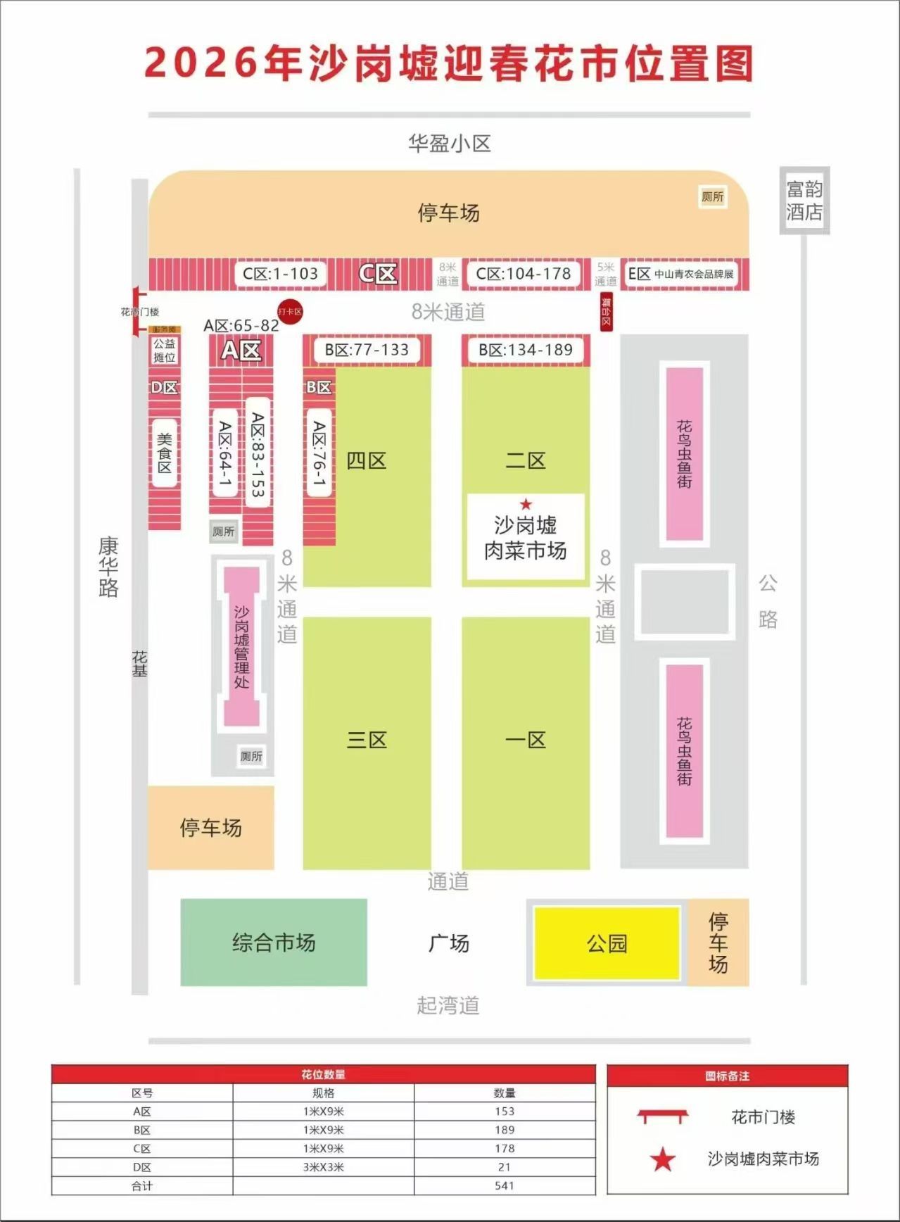 与往年一致,本次花市主入口仍设置在康华路边的沙岗墟场内,场内划分A、B、C、D四大功能区,业态分布清晰。A区主营大吉、小花等年花;B区、C区汇聚蝴蝶兰、盆景、鲜切花等花卉品类,同时涵盖珲春、剪纸等民俗饰品及油角、煎堆等传统年货;D区为美食专区,集中经营各类特色小食。