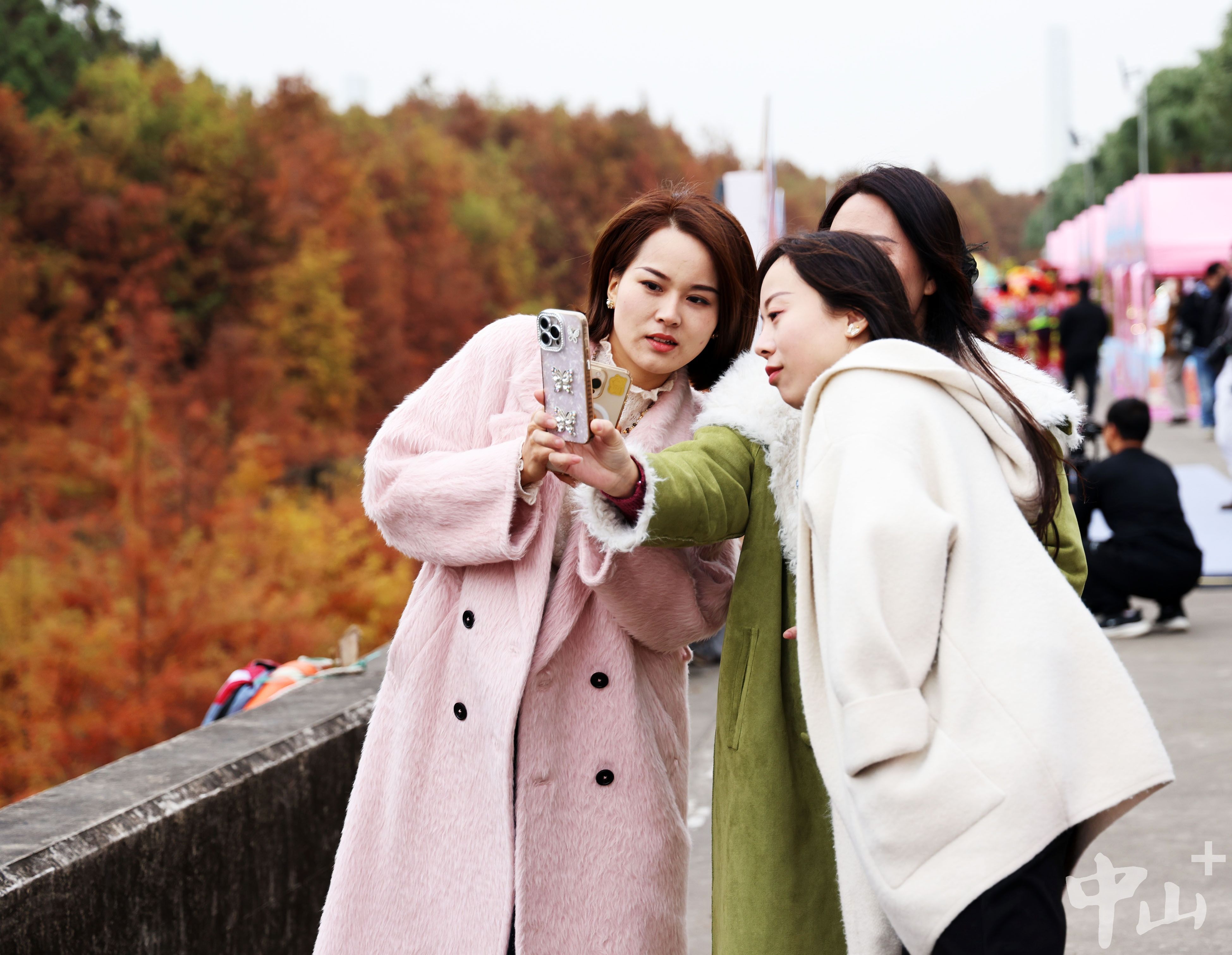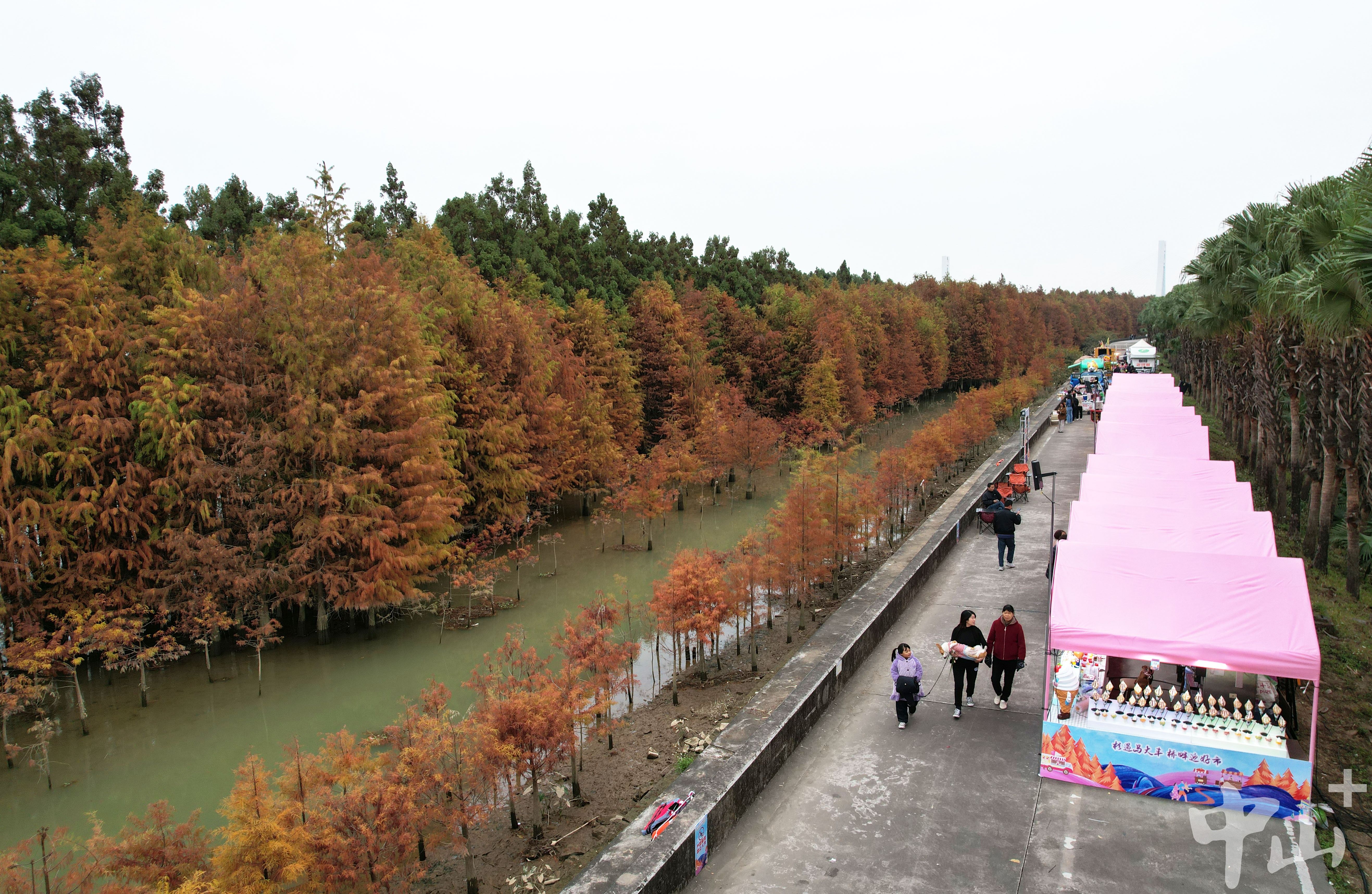 活动开幕后,迅速在社交平台掀起打卡热潮。在杉林深处,来自深圳的王女士一家正举着手机拍照。“早就被港口落羽杉的短视频‘种草’了,特意在工作日过来,避开周末人流。”她兴奋地说,“实景比视频更美,红杉、大桥与市集的烟火气相得益彰,超出预期!”