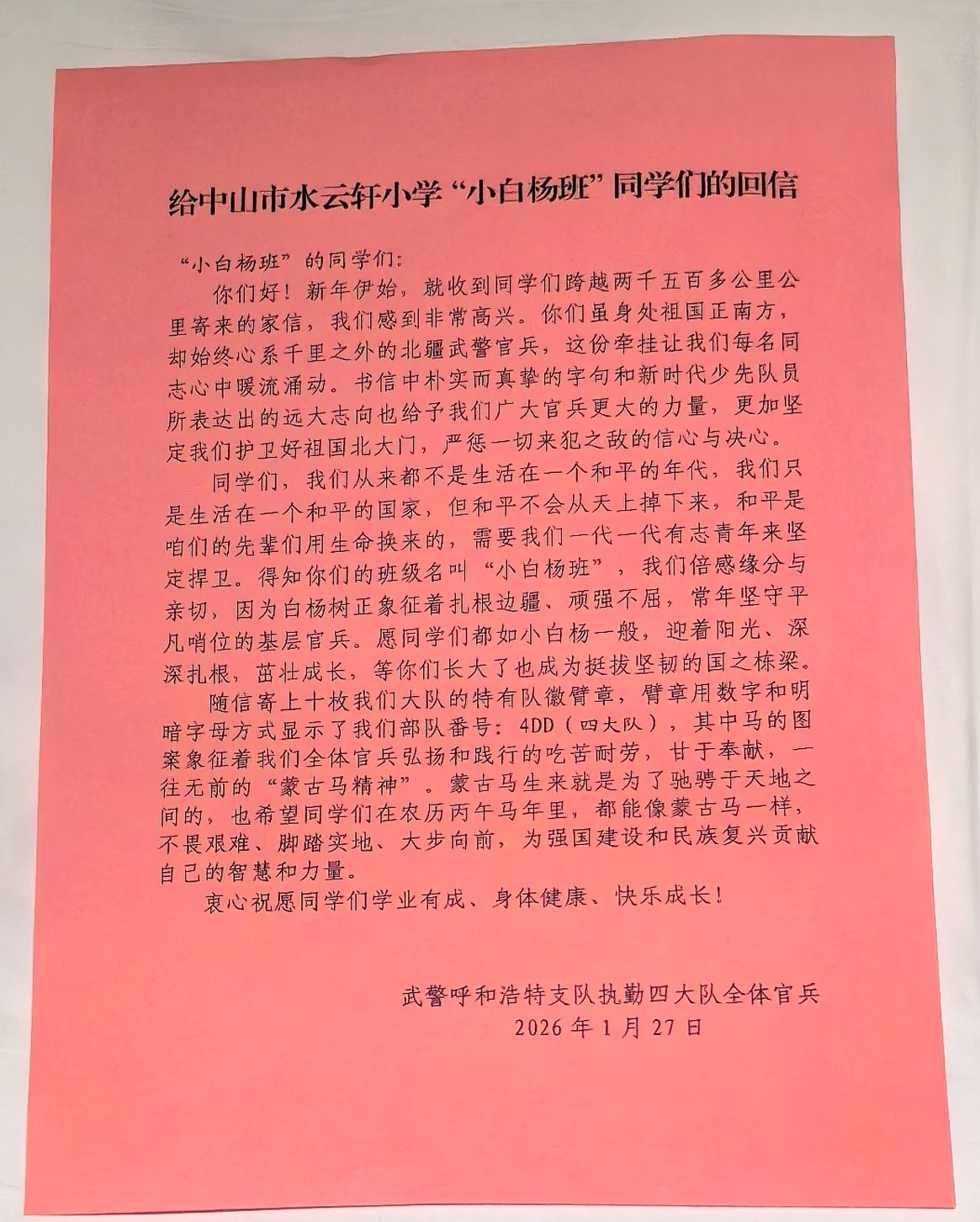 官兵们在信中提到,孩子们虽身处温暖的南方,却心系千里之外的北疆武警官兵,“这份牵挂让我们每名同志心中暖流涌动”。同学们朴实真挚的字句和远大的志向,给予了战士们更大的力量,“更加坚定我们护卫好祖国北大门、严惩一切来犯之敌的信心与决心”。