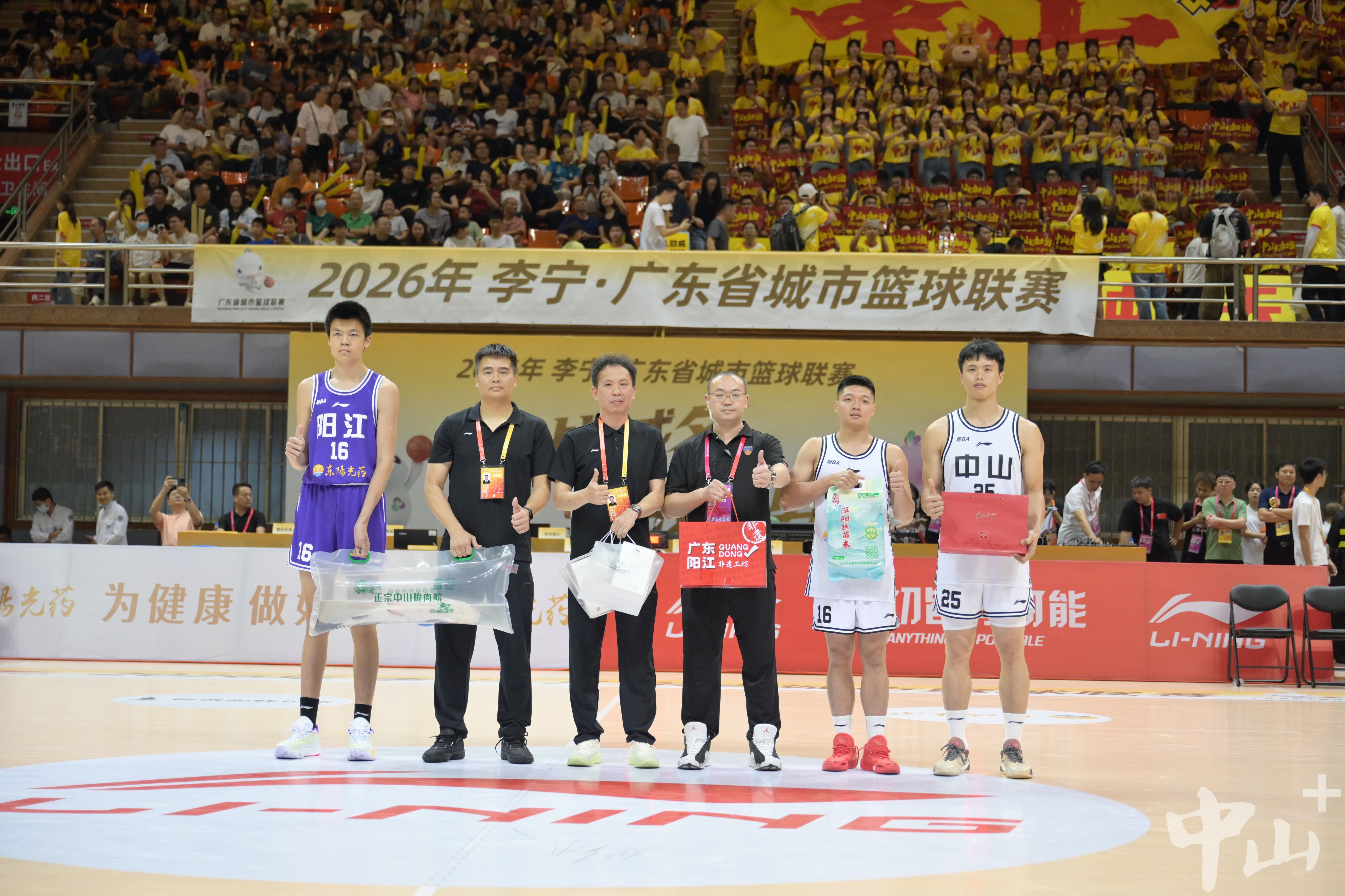 4月11日晚,2026年广东省城市篮球联赛(“粤BA”)常规赛第三轮在中山体育馆打响,中山队主场迎战阳江队。场上激烈比拼,场下温情涌动。比赛中场,双方互赠特色礼物,以物传情,展现珠西都市圈兄弟城市之间的深厚情谊。