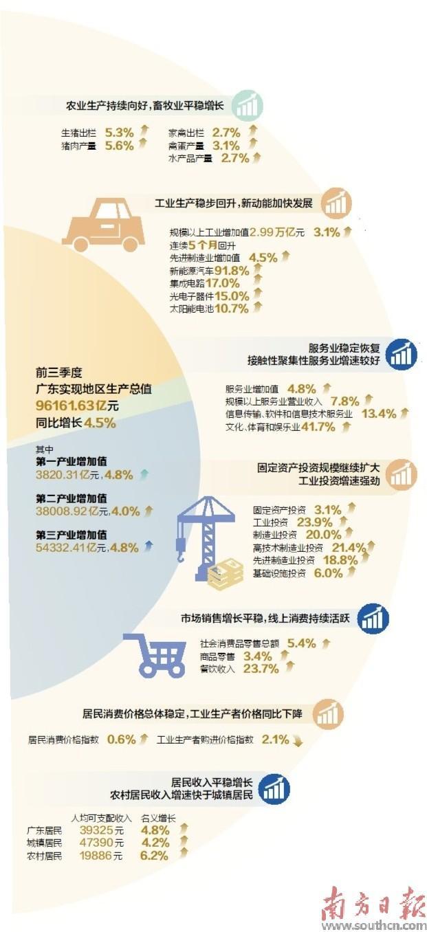 10月23日,广东前三季度经济发展“成绩单”出炉。前三季度,广东实现地区生产总值96161.63亿元,同比增长4.5%,经济运行呈现持续恢复发展态势,主要指标稳定增长。一、二、三产分别增长4.8%、4.0%、4.8%。对照GDP增长5%以上的全年目标,广东前三季度4.5%的增速,意味着在今年第四季度,广东更加要坚定信心、鼓足干劲、奋力冲刺。