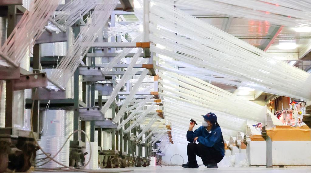 2月5日,春节假期后首个工作日,江苏省连云港经济技术开发区中复碳芯电缆科技有限公司工人在车间查看数字化玻璃纤维拉挤板材生产线运行情况。新华社发(耿玉和 摄)