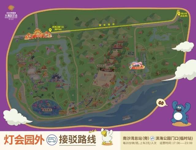 南沙湾公交总站旁(靠近2号门周边停车场)上车点至滨海公园大门口(靠近1号门周边停车场),每二十分钟一班,上车二元,接驳时间17点到23点。