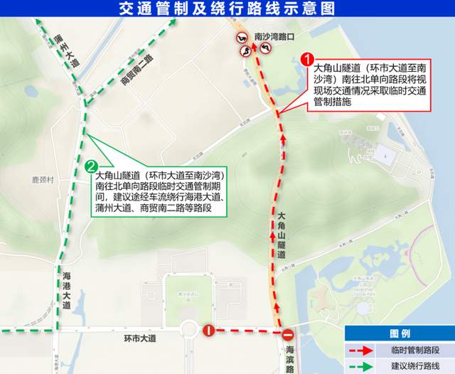 环市大道南(霍英东研究院路口至海滨路)西往东方向、大角山隧道(环市大道至南沙湾)南往北方向。