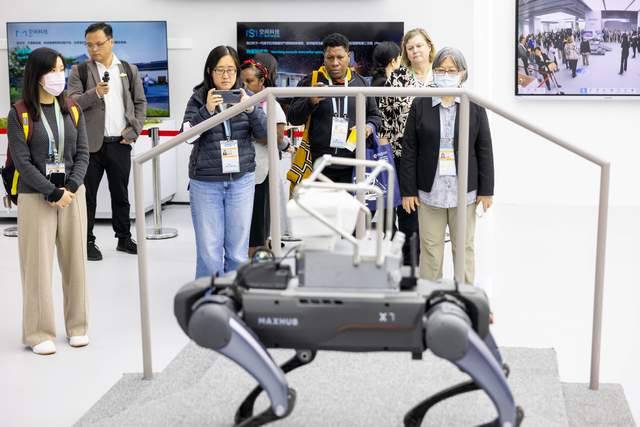 外宾们参观并体验四足机器狗的各种功能。 南方+ 梁钜聪 拍摄
