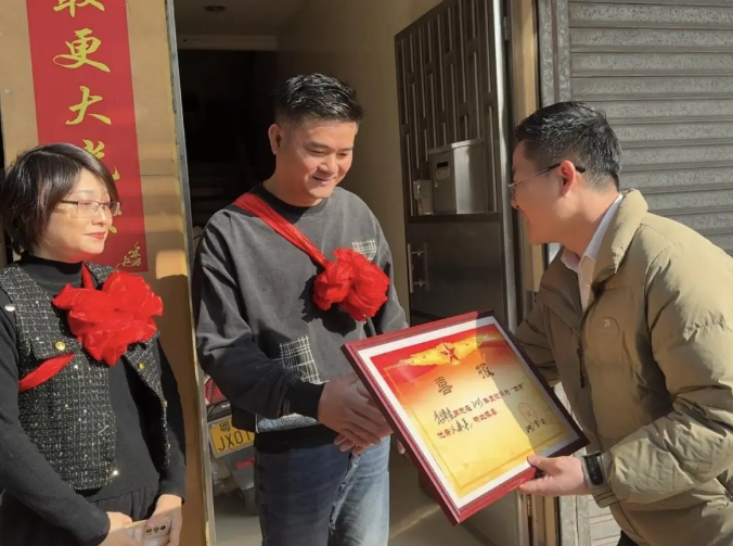 沙溪镇为9名2025年度“四有”优秀士兵家属集中送喜。镇领导率慰问组分批登门,为军属佩戴光荣红花、宣读喜报。其中,溪角社区戴维骏作为“四有”优秀军官,恰逢新婚在即,喜报成为一份特殊的“婚前贺礼”,既褒奖军人贡献,亦致敬军属付出。家属们接过喜报时自豪满溢,纷纷表示将全力支持子女安心服役、再立新功。