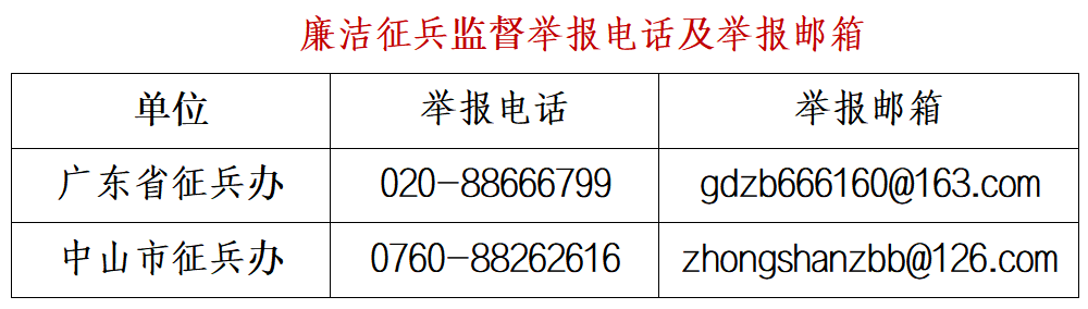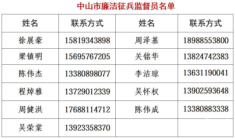 为严明兵员征集纪律,筑牢廉洁征兵底线,进一步提升征兵工作透明度,中山市征兵办将2026年我市廉洁征兵监督员名单及监督举报电话、邮箱予以公布。广大市民若发现征兵违法违纪线索或廉洁征兵问题,可向廉洁征兵监督员反映举报,也可直接拨打省、市监督举报电话,或发送邮件至指定信箱反馈。